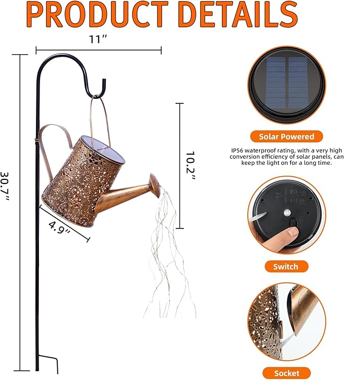 • 【Easy Installation】Installation is straightforward: attach the spout, tighten the hook parts, and then place or hang the solar watering can light as desired. Enjoy its beauty with ease.