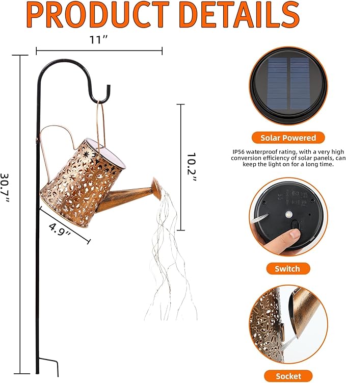 • 【Easy Installation】Installation is straightforward: attach the spout, tighten the hook parts, and then place or hang the solar watering can light as desired. Enjoy its beauty with ease.