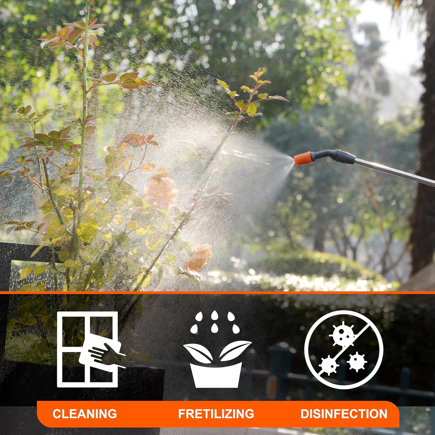 • 【Retractable Wand 】The home garden sprayer offers a variety of spray patterns from straight stream to a very fine mist and anything in between with its rotatable spray tips allowing you to customize the way your water will spray.This portable sprayer bottle is leak free, so you don’t need to worry about water leakage and mess.The retractable wand can extend to 28 inches to help you spray hard-to-reach places.