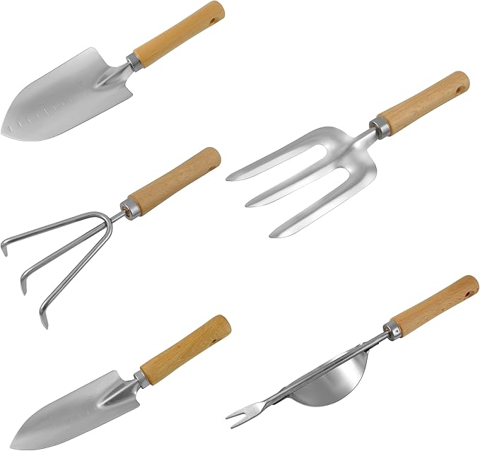 • 🌻DURABLE, HIGH-QUALITY HAND TOOLS – This set includes a hand trowel, transplanter, rake, fork, and weeder, all made from premium rust-resistant metal with ergonomic anti-slip handles to maximize comfort and durability.
