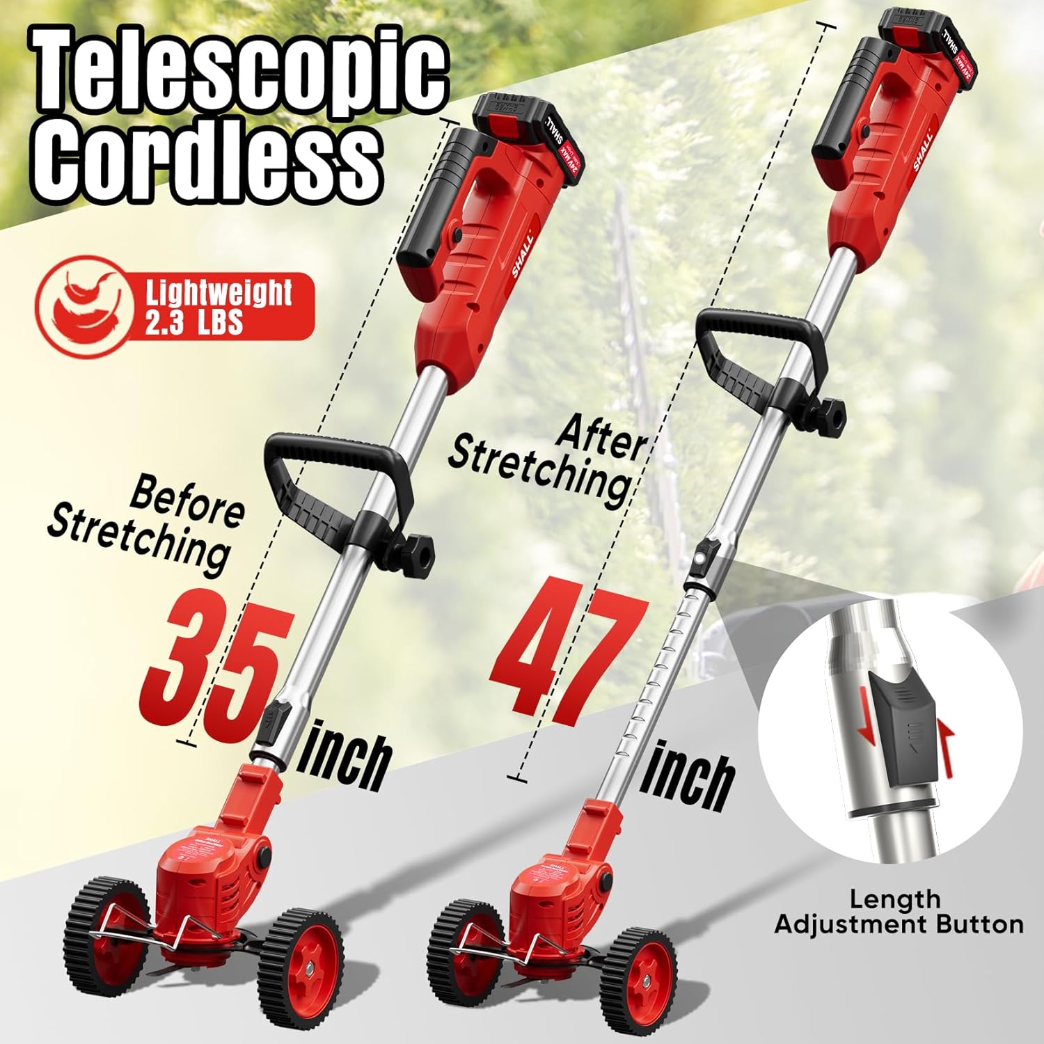 • [Rotatable Head & Removable Wheels] - The head angle of battery powered weed eater (cortadora de pasto) can be adjusted from 0-90°, which makes it easy to trim in tight spaces or uneven terrain; The wheels are removable and can easily converts from a trimmer to a wheeled edger