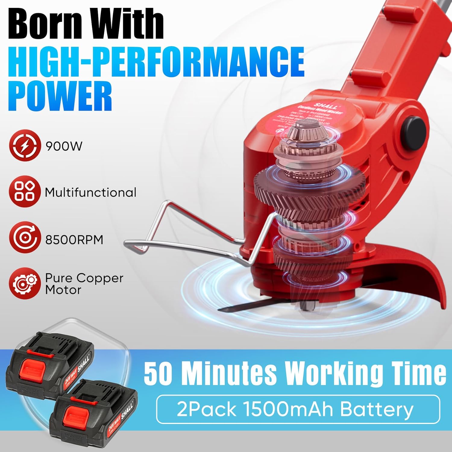 • [Powerful Battery & Motor] - Cordless string trimmer is equipped with a pure copper motor and 2 x 24 V / 1500 mAh rechargeable lithium battery and a fast charger, which allows long continuous working time with low noise; Each battery lasts up to 50 minutes on a full charge