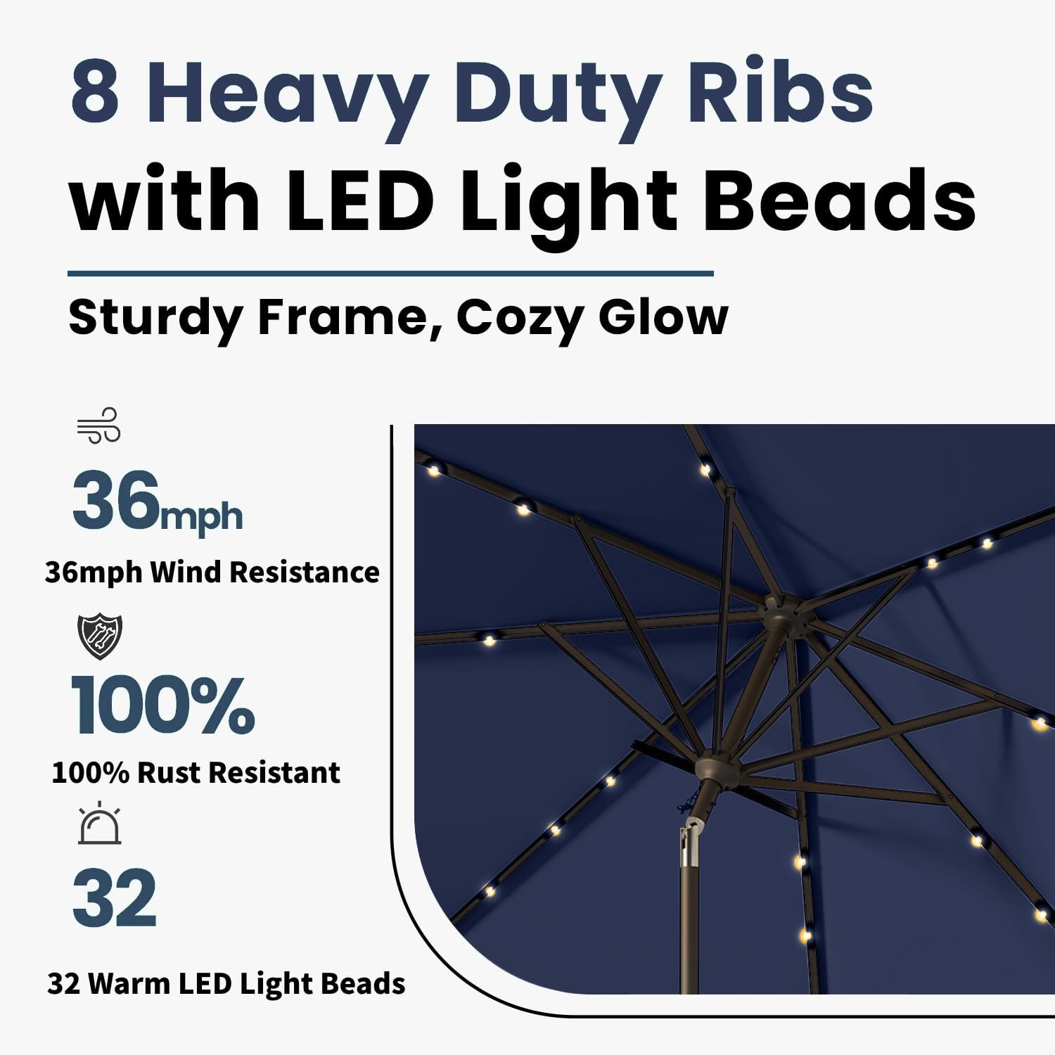9FT Solar Umbrella 32 LED Lighted Patio Umbrella Table Market Umbrella w/Tilt and Crank, UV-Resistant Outdoor Umbrella for Pool, Garden, Deck, Navy Blue