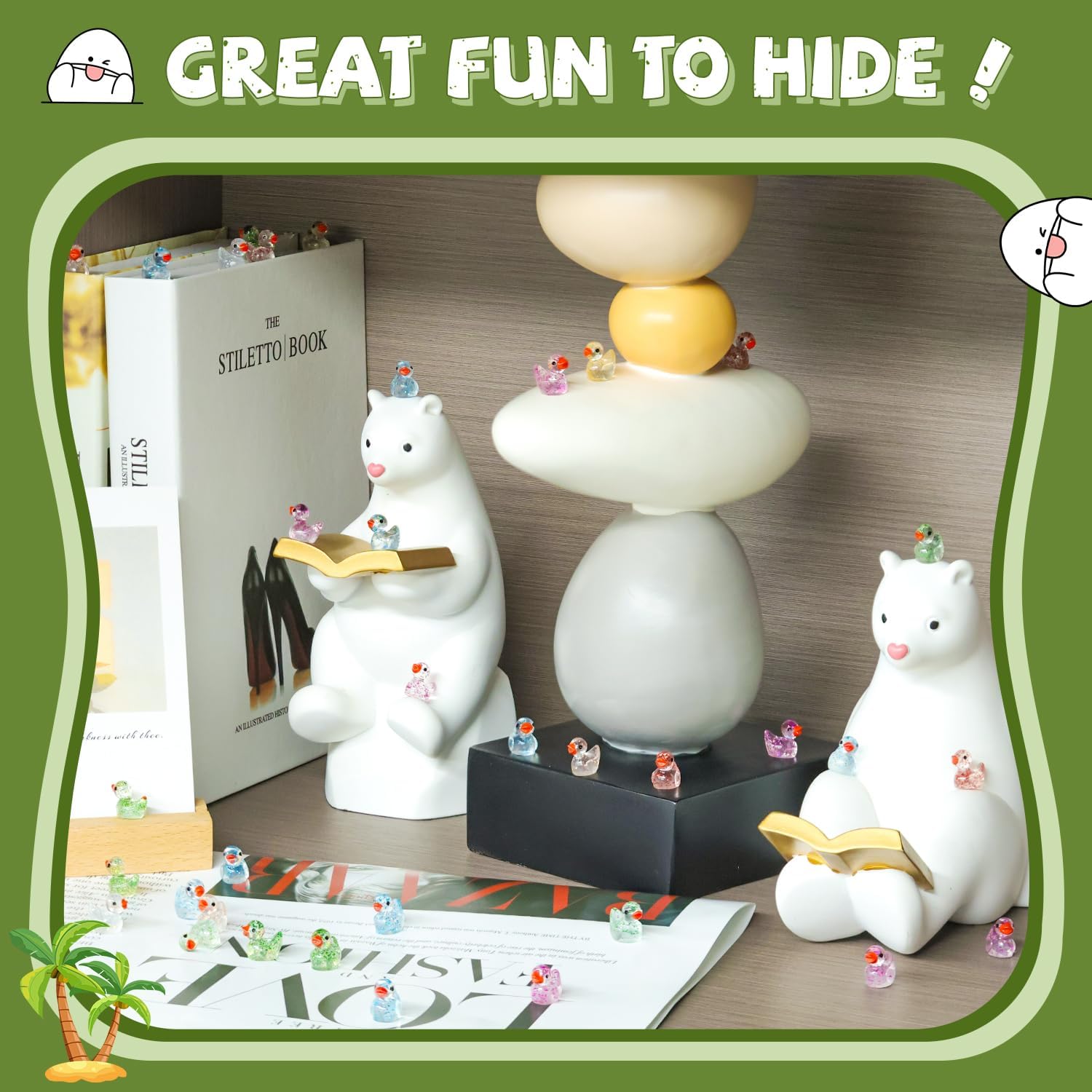 • PACKAGE CONTENT -- One Package includes 120 pcs colorful giltter mini ducks, each tiny figure is crafted with intricate details and vibrant colors, making them cute and eye-catching.Use them to add charm for crafting, or having hide games to enhance fun