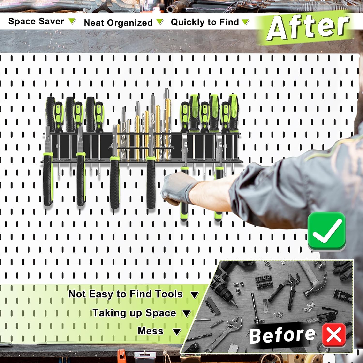 • Quick Access To Tools: This tool rack neatly organizes screwdrivers, pliers, and drill bits for easy access at a glance