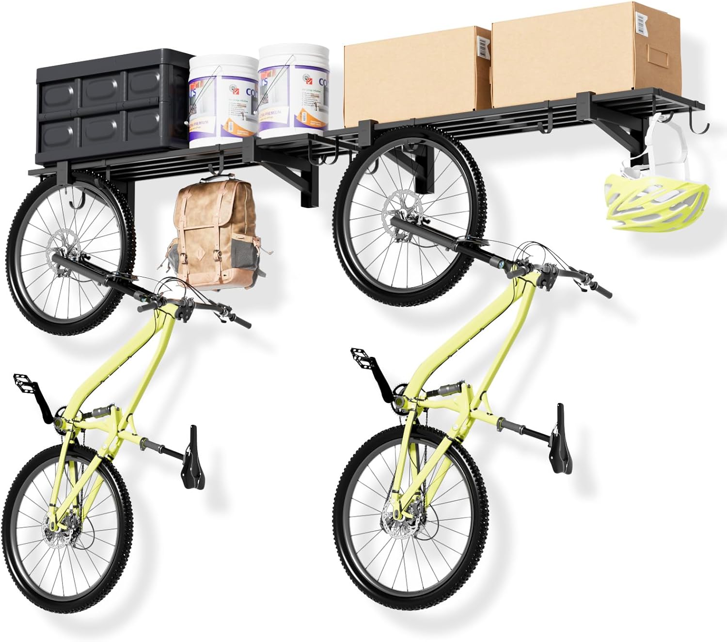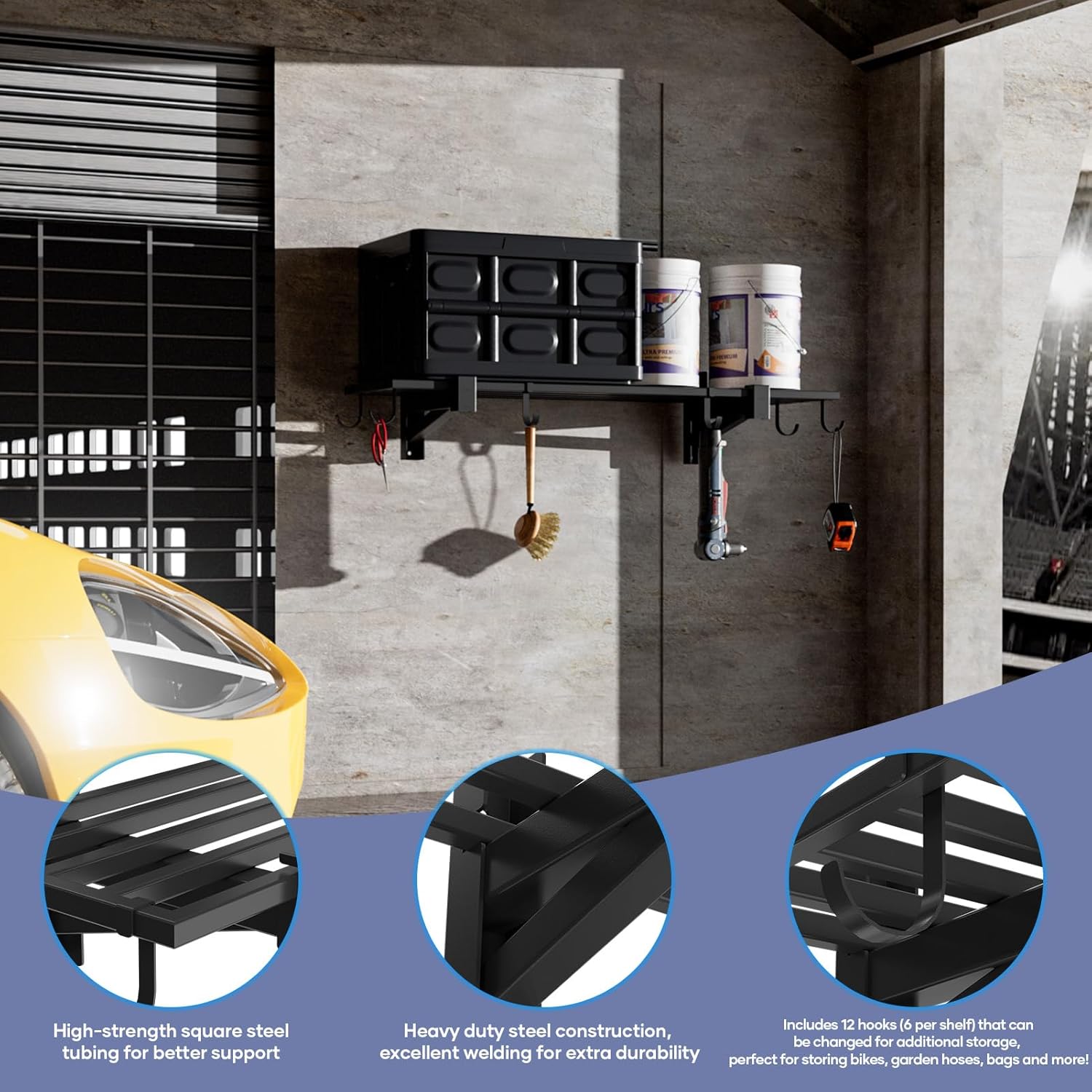 • Multiple storage functions: each garage wall mount shelf provides six hooks, which can maximize the storage function of the shelf to meet a variety of storage needs, while keeping the environment neat and tidy