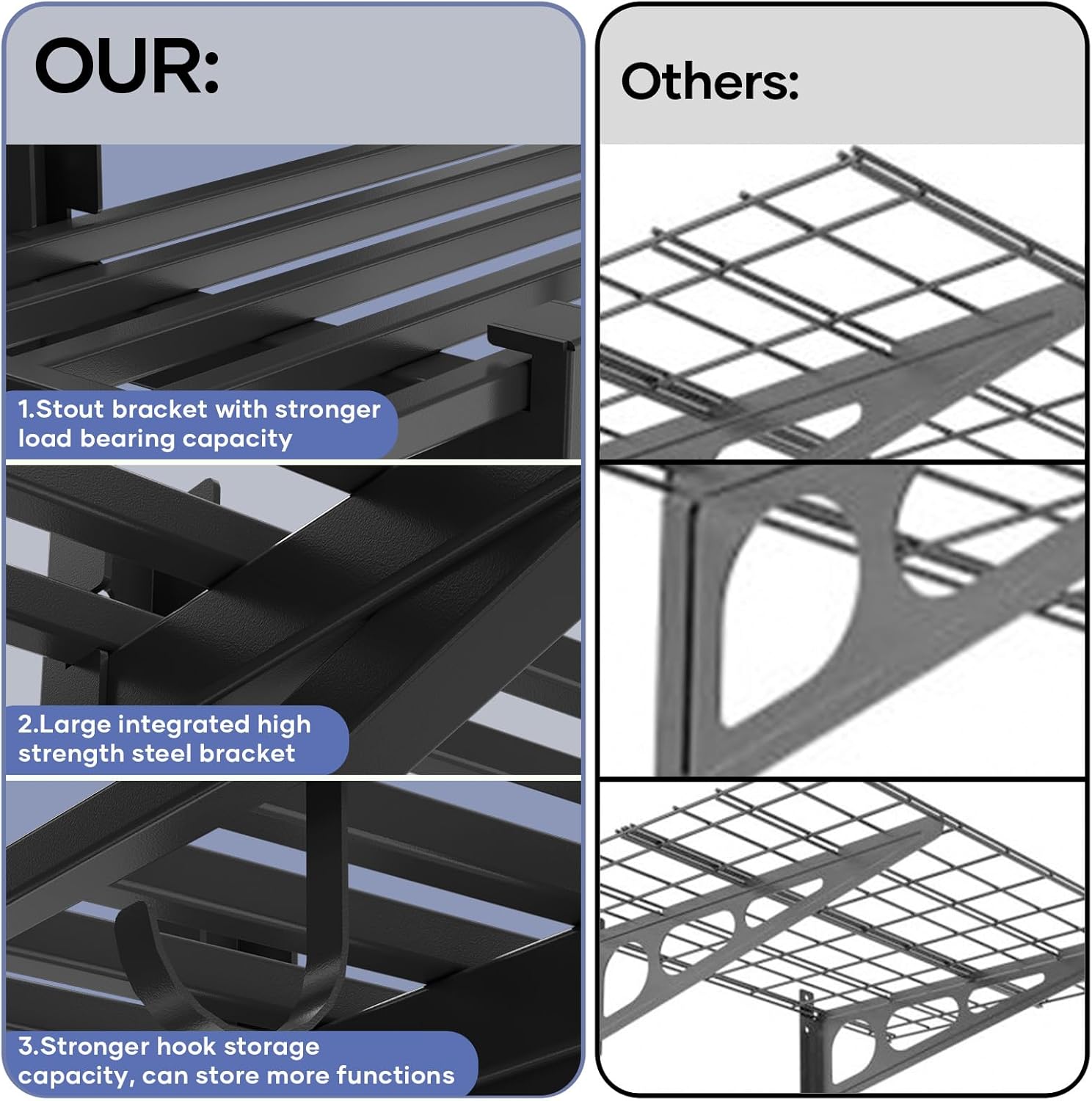 • Suitable for installation on different wall surfaces:Our garage wall mounted shelving is available with two different stainless steel studs for use on wood and concrete walls and can be installed in a variety of wall environments.