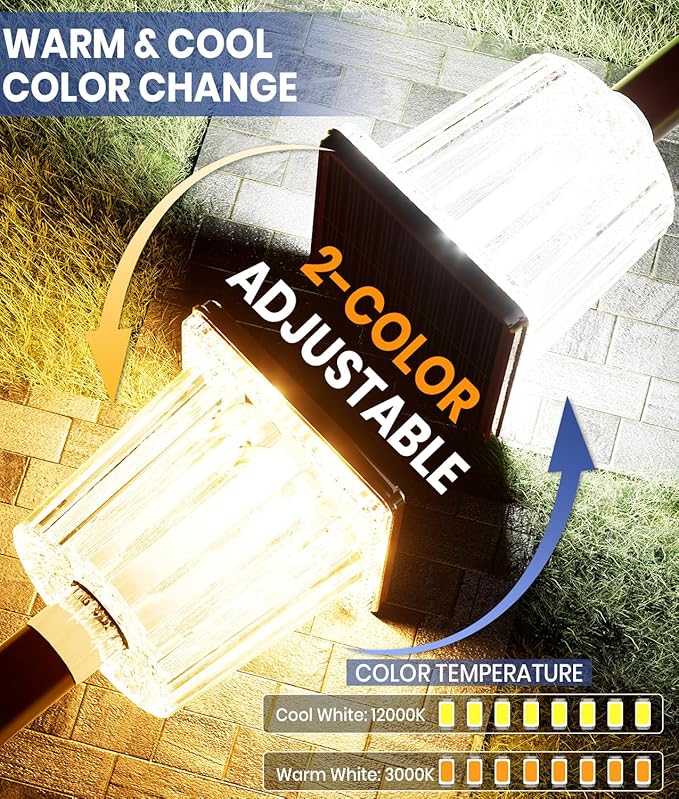 • 🌓 Dual-Tone Landscape Lighting System ▷§▁ Easily toggle the button on the back edge of the solar panel powered, change between adjustable warm white (fall/winter coziness❄️) and cool white (spring/summer vibes🌼). Adapt seasonally solar outdoor garden decor and create a holiday atmosphere moods outside lights for house.