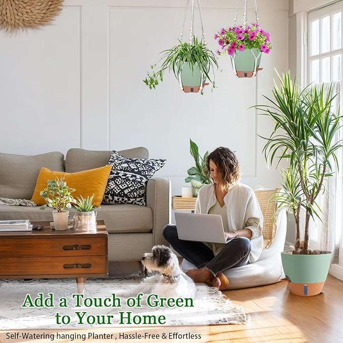 • 【Smart Self-Watering System】 Our hanging plant pots come with a REMOVABLE RESERVOIR TRAY that stores 7-10 day water supply. Absorbent cotton ropes automatically deliver moisture to soil when needed - ideal for vacations or busy lifestyles. Spend less time watering hanging baskets for indoor plants!