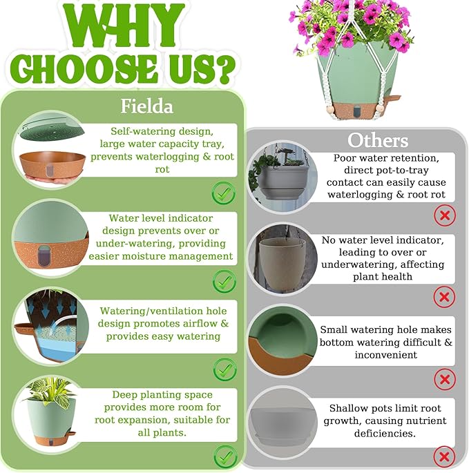 • 【Healthy Roots, Happy Plants】Our hanging planters feature GRID DRAINAGE HOLES at the bottom to quickly drain excess water and prevent standing water, while side ventilation ports maintain airflow around roots. The patented NO-SPILL WATERING LIP allows precise watering even in hard-to-reach hanging positions. No more messy water stains - just healthier plants that thrive!"