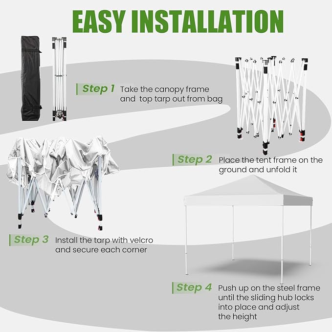 • Easy Up Canopy: This pop up tent can be assembled or packed in 5 minutes by its pop up design. Lightweight assembly design avoids the hassle of traditional tents, giving you more time to enjoy your activities. With three adjustable height settings, this canopy tent offers versatile options for any outdoor occasion, like camping or parties