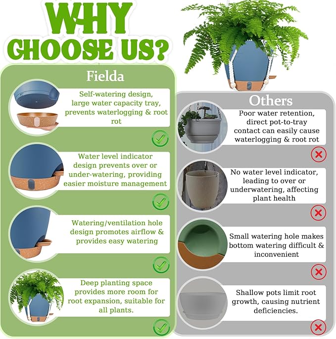 • 【Never Over/Underwater Again!】Fielda's indoor hanging planters feature an EXCLUSIVE WATER WINDOW in the base tray - instantly check moisture levels without guesswork! Protect your plants from dehydration and promote healthy root systems with this visual watering guide. Perfect for hanging pots for indoor plants enthusiasts who value scientific plant care.