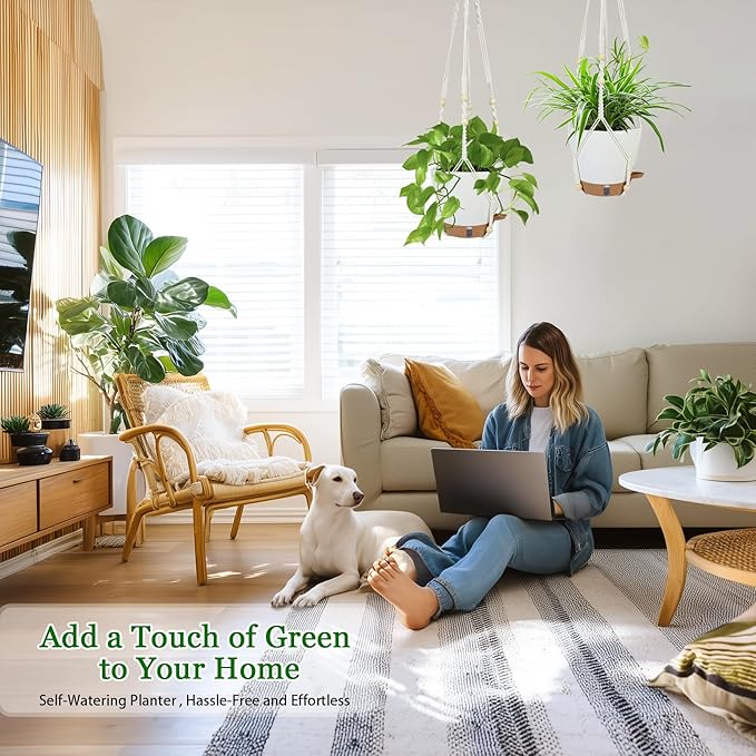 • 【Smart Self-Watering System】 Our hanging plant pots come with a REMOVABLE RESERVOIR TRAY that stores 7-10 day water supply. Absorbent cotton ropes automatically deliver moisture to soil when needed - ideal for vacations or busy lifestyles. Spend less time watering hanging baskets for indoor plants!