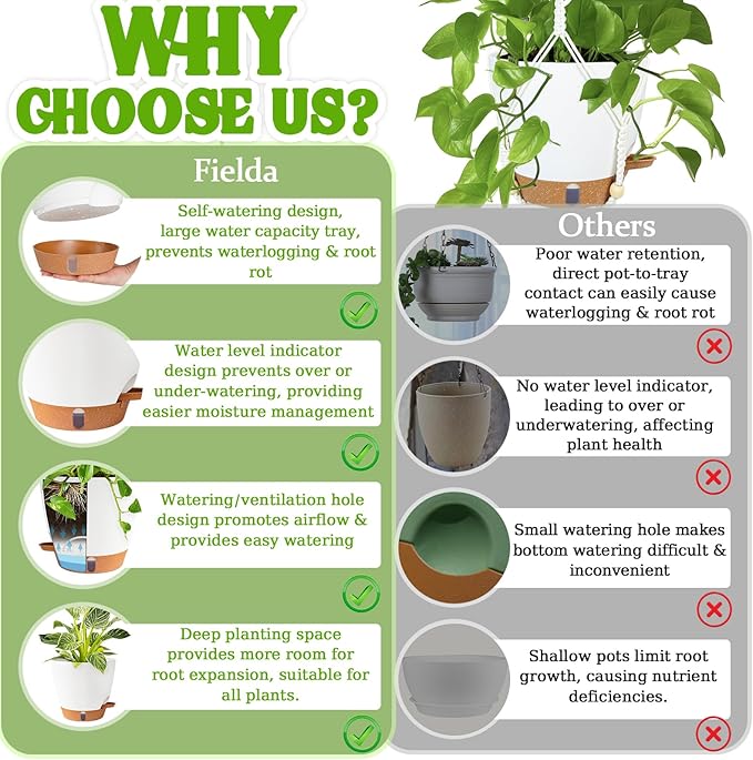 • 【Never Over/Underwater Again!】Fielda's indoor hanging planters feature an EXCLUSIVE WATER WINDOW in the base tray - instantly check moisture levels without guesswork! Protect your plants from dehydration and promote healthy root systems with this visual watering guide. Perfect for hanging pots for indoor plants enthusiasts who value scientific plant care.