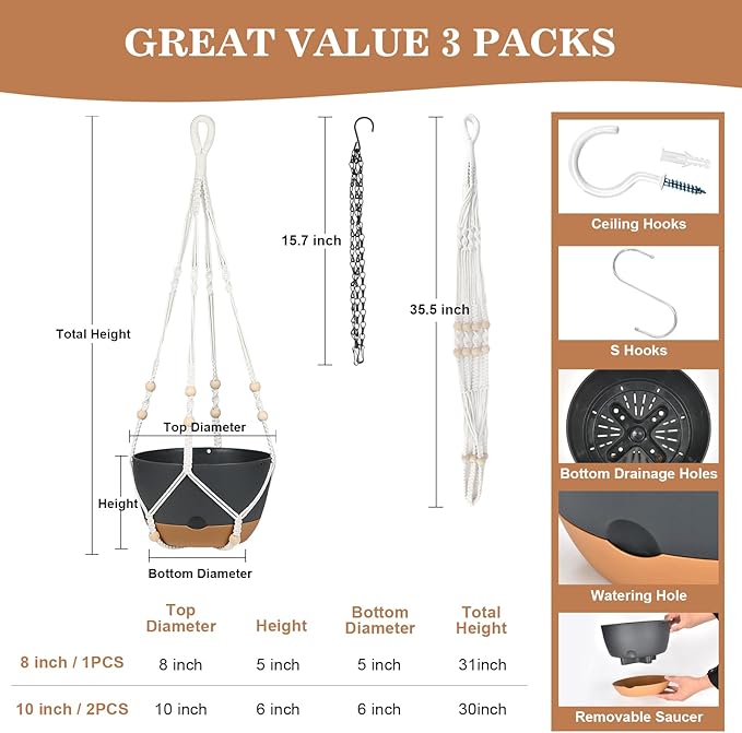 • 【GREAT VALUE PACK】 - Each package includes 3pcs macrame plant hangers and chain plant hangers, 3pcs plastic selfwatering plant pots and saucers 8" / 10" / 10", and 3pcs ceiling and s hooks.