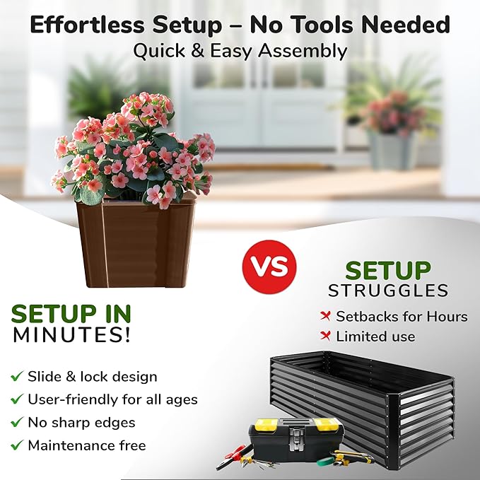 • EASY ASSEMBLY, NO TOOLS REQUIRED: With a snap-together design, setting up your garden bed takes just minutes! No screws or tools necessary, making this a hassle-free choice for busy gardeners looking for a simple and quick setup.