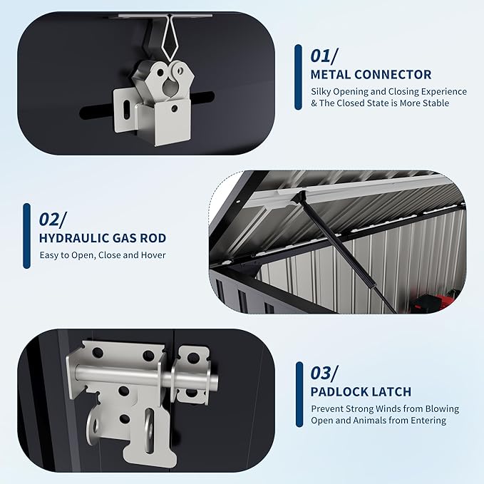 • REFINED MATERIAL & SOLID STRUCTURE - The metal garbage can storage shed, constructed with galvanized steel and coated in black powder, exhibits exceptional sturdiness and durability for long term usage. The superior structural design guarantees the top has an exceptional load bearing capacity, enabling it to withstand winds of up to six levels. This resilient material is resistant to UV rays, ensuring that it will not fade or discolor after prolonged exposure to the sun