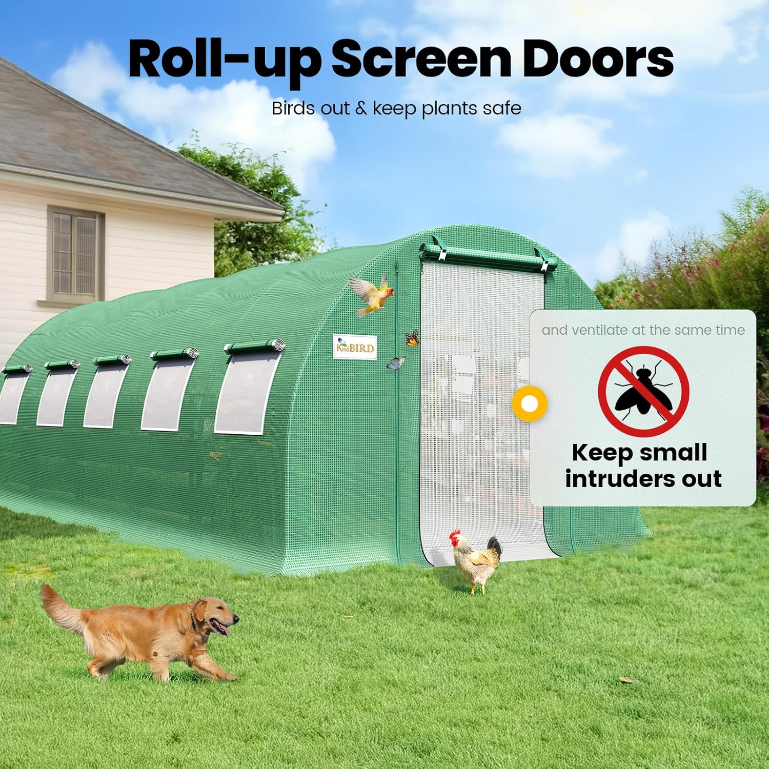 KING BIRD Premium 25x10x6.6FT Greenhouse for Outdoors, Large Walk-in Heavy Duty Galvanized Steel Frame, Mesh Door Screen Window Upgraded Zipper Tunnel Hoop for Garden Plant Winter, Green