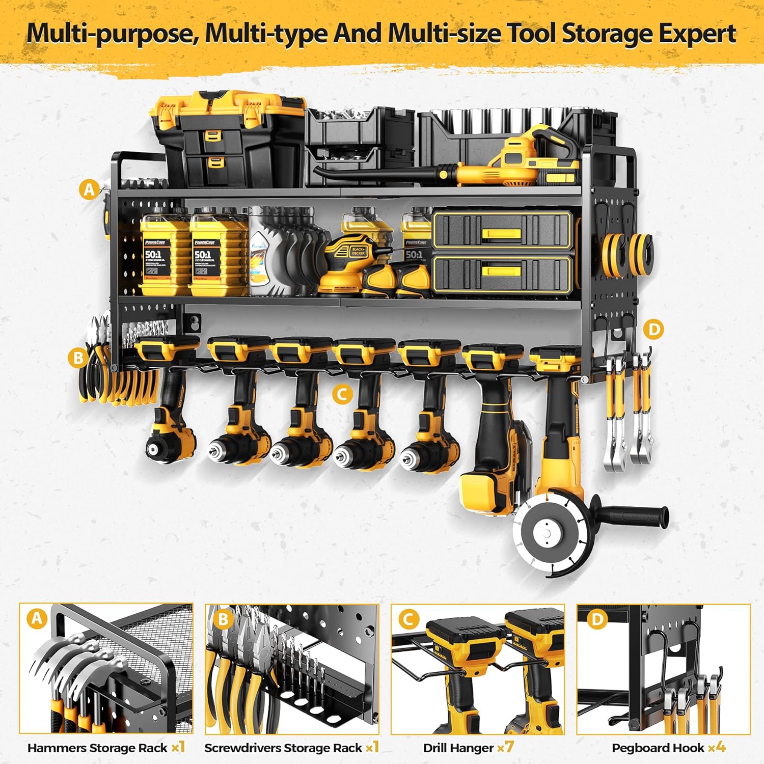 • 【7 Drill holder & Heightening Space】This power tool hanger is taller and wider than others. 7 Drill holder and high tool boxs can be stored. Our power tool holder can hold your power tools of any weight. Easily organize your toolbox, drills, chargers, batteries, hammers, and screwdrivers. Optimizes your garage storage.