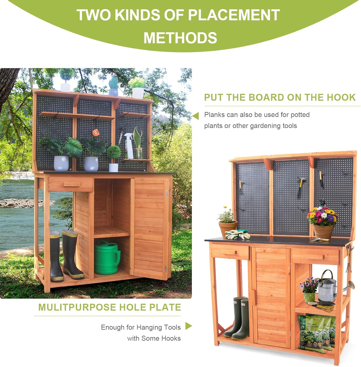 • 【Premium Natural Fir Wood】:Potting bench for outside is specially designed for your garden,The main body is 100% fir wood and configure a holey metal plate,complimentary 18 hooks used for metal hole board.Configured with 5 pieces of laminate used for slatted shelf ,Feel free to mix and match the way you want to use it