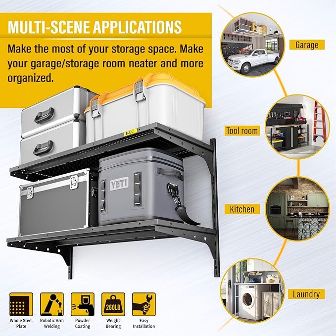 • 260lb Load Tested: Each panel of our Brukid heavy-duty wall shelf has been rigorously tested to support 130 lbs, with the 2-tier (1.3x3ft) unit offering a combined weight capacity of 260 lbs. Built for strength and reliability, it's perfect for heavy tools, equipment, or storage needs.