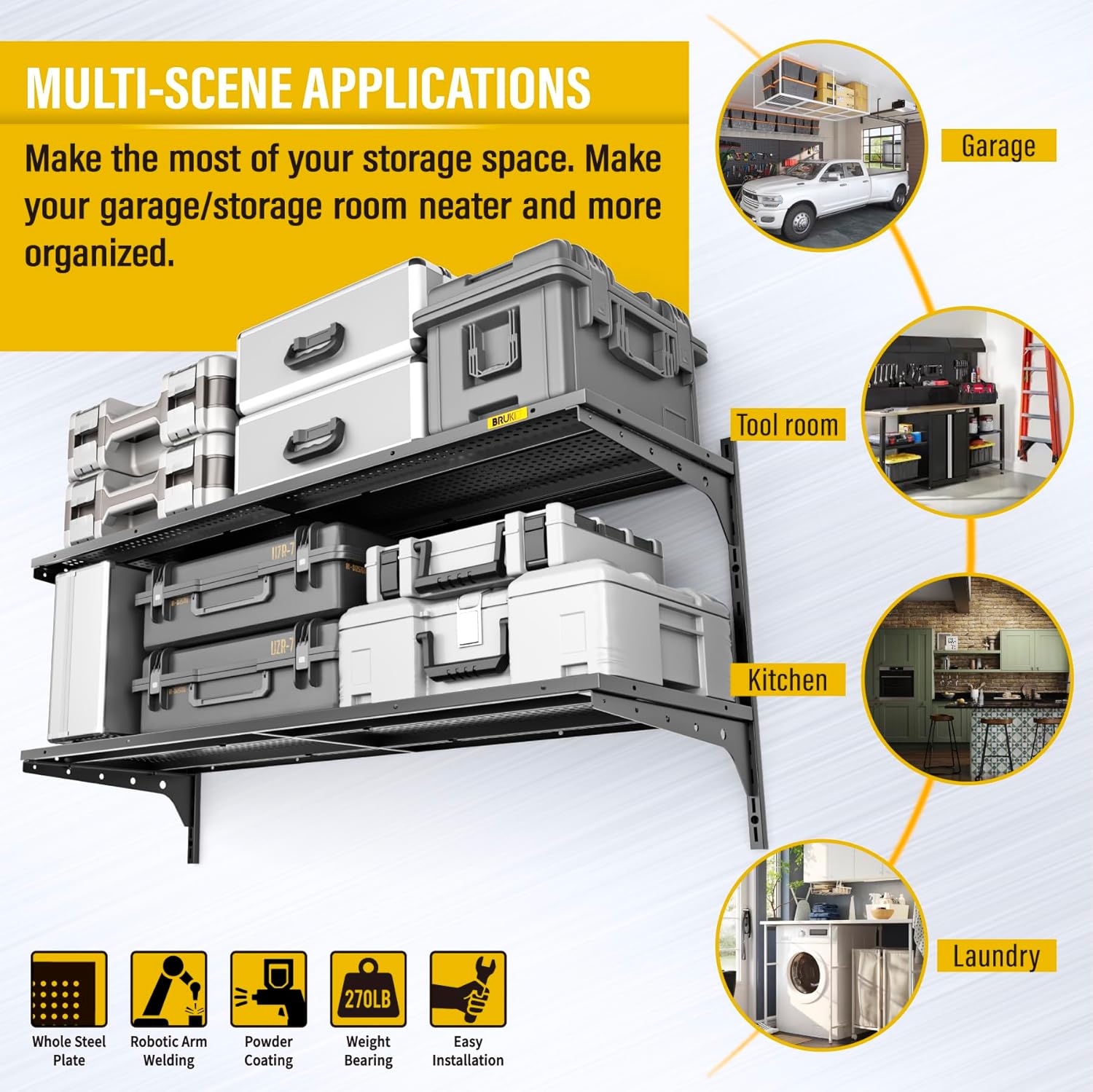 • 270lb Load Tested: Each panel of our Brukid heavy-duty wall shelf has been rigorously tested to support 135 lbs, with the 2-tier (1.3x4ft) unit offering a combined weight capacity of 270 lbs. Built for strength and reliability, it's perfect for heavy tools, equipment, or storage needs.