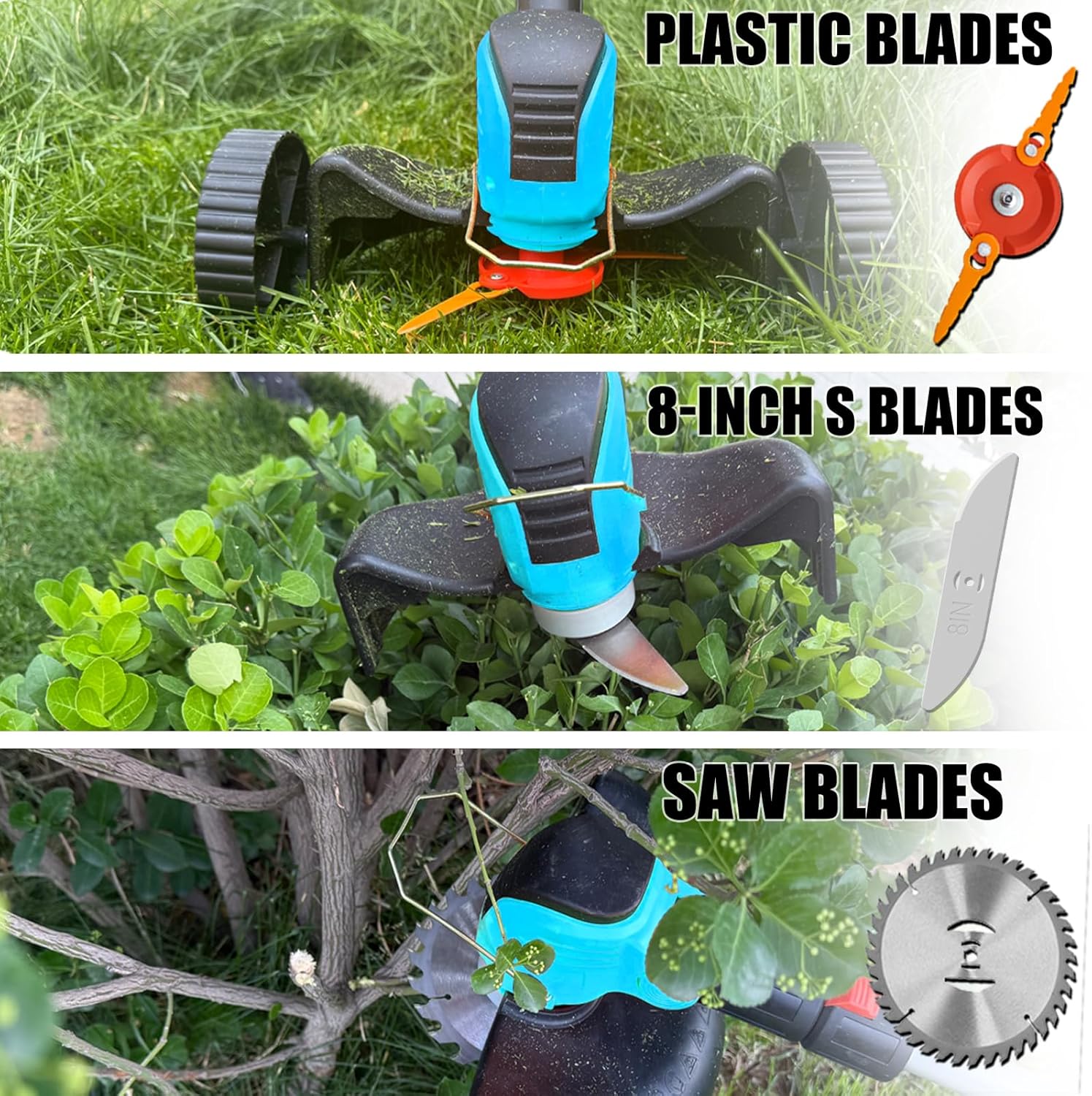 • 【3-IN-1 Battery Weed Wacker】 The weed wacker battery powered with 3 types of blades, which can easily cope with different scenarios. ①S-Manganese Steel Blade suitable for cutting thick weeds and hedges; ②Saw blade suitable for pruning branches or bushes; ③Plastic blades are only suitable for cutting tender grass. If your garden grass is very lush, it is recommended to use a metal blade directly. More professional tools can make your gardening work easier and more enjoyable