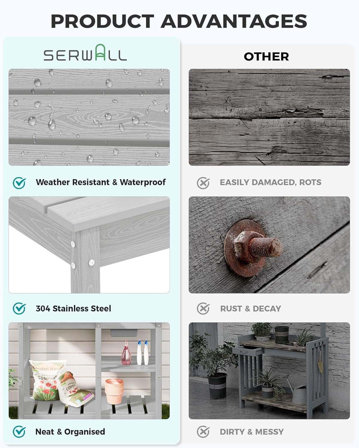 • HDPE Material: Constructed from 100% HDPE material, the SERWALL outdoor potting bench offers high strength and stability, ensuring a long service life. Potting bench table is durable for outdoor use in any weather condition.