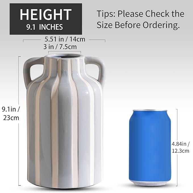 • 【Premium-Scale Craftsmanship】 Crafted from durable ceramic measuring 9.1"x5.9"x5.5", this substantial vase with handle combines functionality with decor impact. The weighted base ensures stability for floral arrangements, while the earthy color palette seamlessly integrates with beige vases for decor living room schemes and modern farmhouse aesthetics.