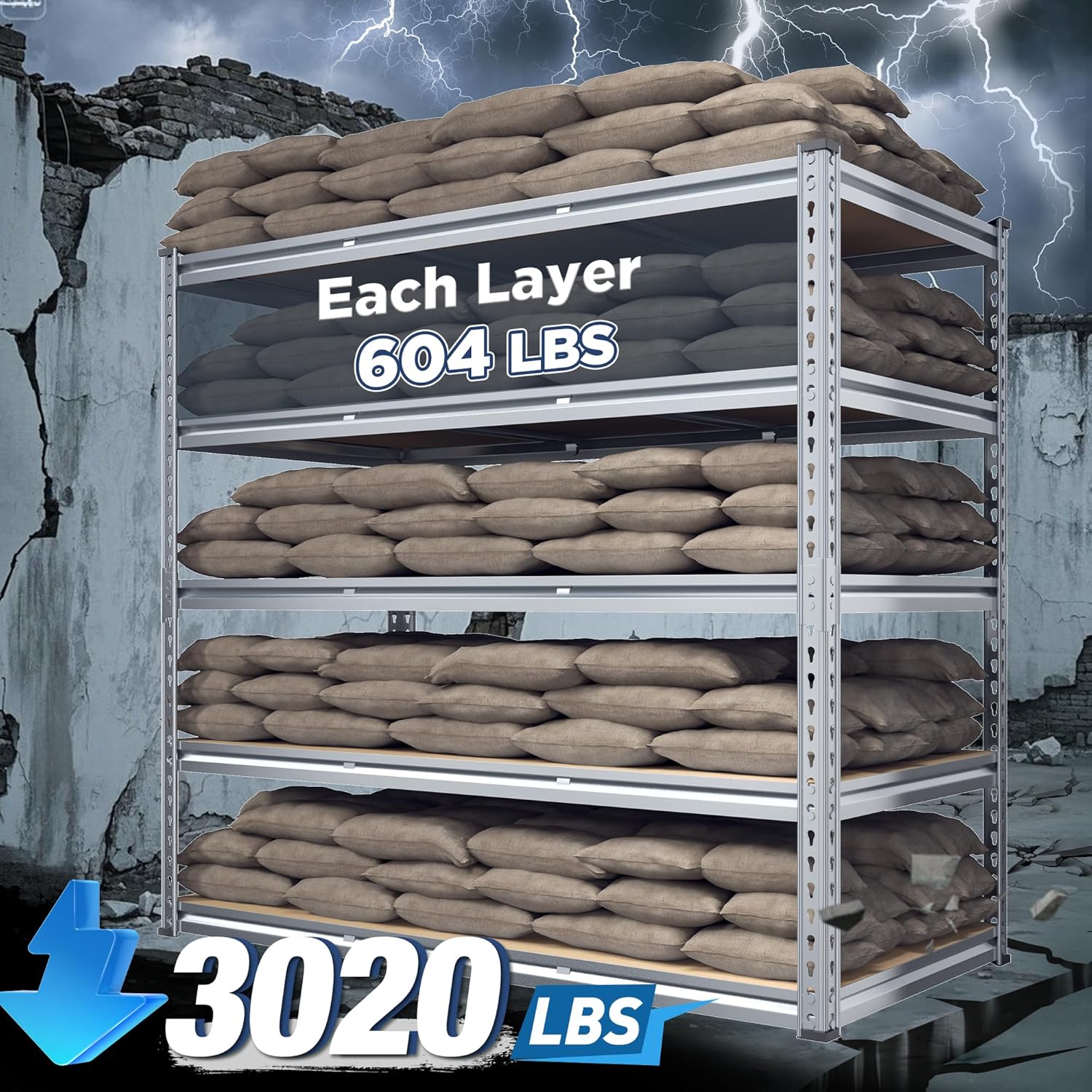 • 【Garage Shelving Heavy Duty - 3020LBS Capacity】REIBII garage shelves are built like a tank! Thick steel legs and chunky boards can carry 604lbs on each shelf – that's 3020lbs total! Suit for stacking toolboxes, car parts, or even your camping gear. No wobbling, no bending, just rock-solid storage