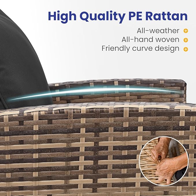 • Durable & Strength Structure:The patio conversation set is made of thick, high-quality rattan material that is weather-resistant, sturdy, and crack-resistant. This patio furniture set also features a powder-coated steel frame as its core for extra strength. Each seat can hold up to 310 lbs