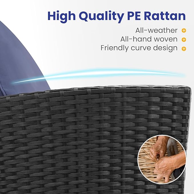 • Durable & Strength Structure:The patio conversation set is made of thick, high-quality rattan material that is weather-resistant, sturdy, and crack-resistant. This patio furniture set also features a powder-coated steel frame as its core for extra strength. Each seat can hold up to 310 lbs