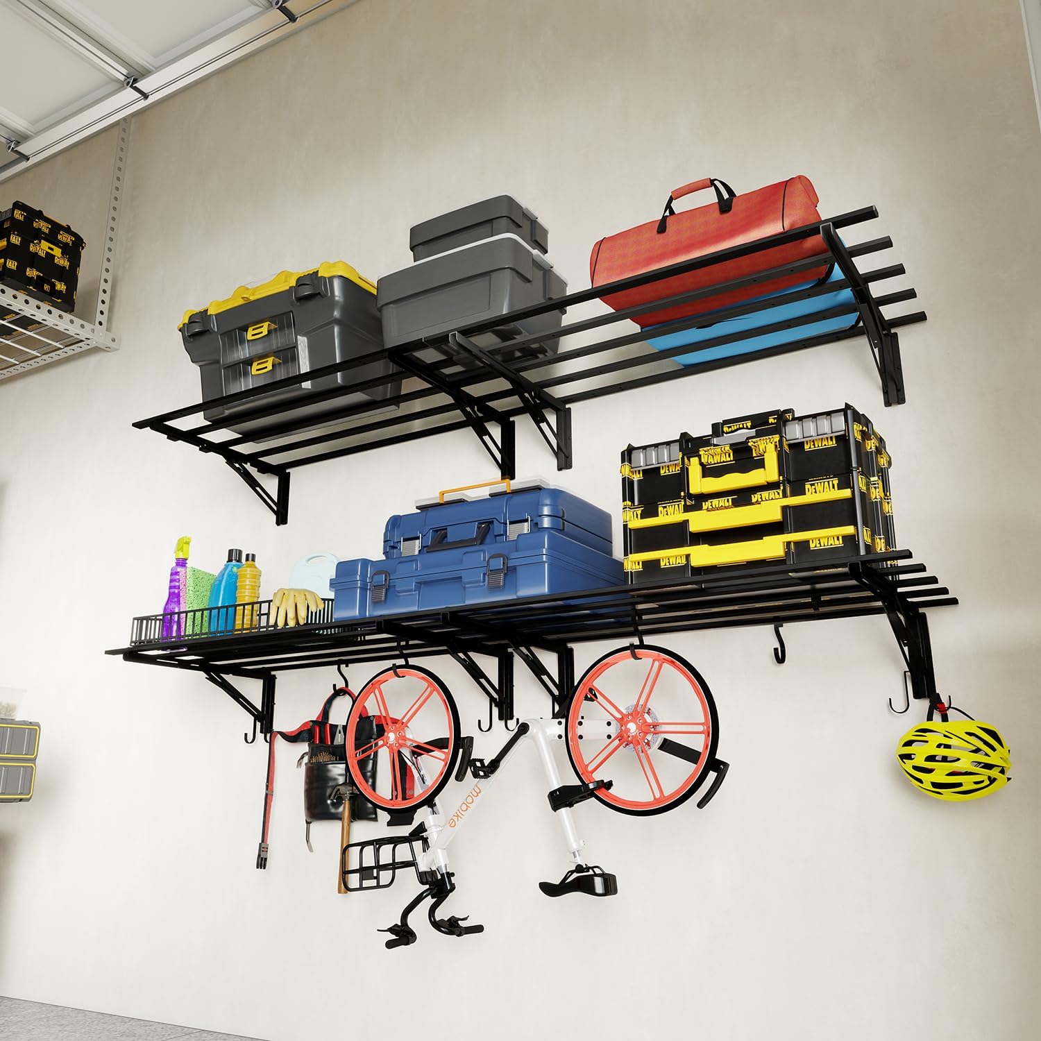 • ๐ˆ๐ง๐ญ๐ž๐ ๐ซ๐š๐ญ๐ž๐ ๐‡๐จ๐จ๐ค๐ฌ ๐Ÿ๐จ๐ซ ๐„๐š๐ฌ๐ฒ ๐Ž๐ซ๐ ๐š๐ง๐ข๐ณ๐š๐ญ๐ข๐จ๐ง: This garage wall shelf includes sturdy hooks for hoses, cords, and tools. Perfect garage wall shelves for decluttering, it turns chaos into neat, accessible garage shelves wall mounted storage.