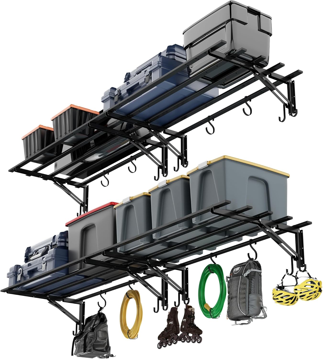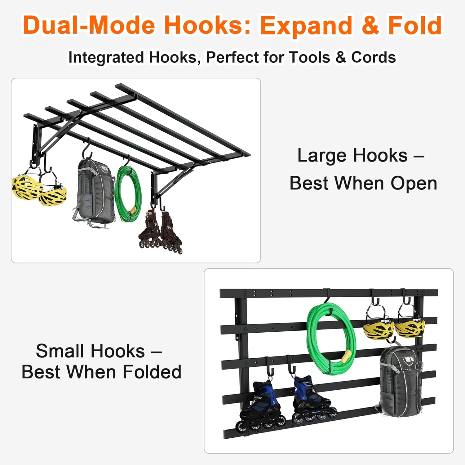 • 𝐈𝐧𝐭𝐞𝐠𝐫𝐚𝐭𝐞𝐝 𝐇𝐨𝐨𝐤𝐬 𝐟𝐨𝐫 𝐄𝐚𝐬𝐲 𝐎𝐫𝐠𝐚𝐧𝐢𝐳𝐚𝐭𝐢𝐨𝐧: This garage wall shelf includes sturdy hooks for hoses, cords, and tools. Perfect garage wall shelves for decluttering, it turns chaos into neat, accessible garage shelves wall mounted storage.