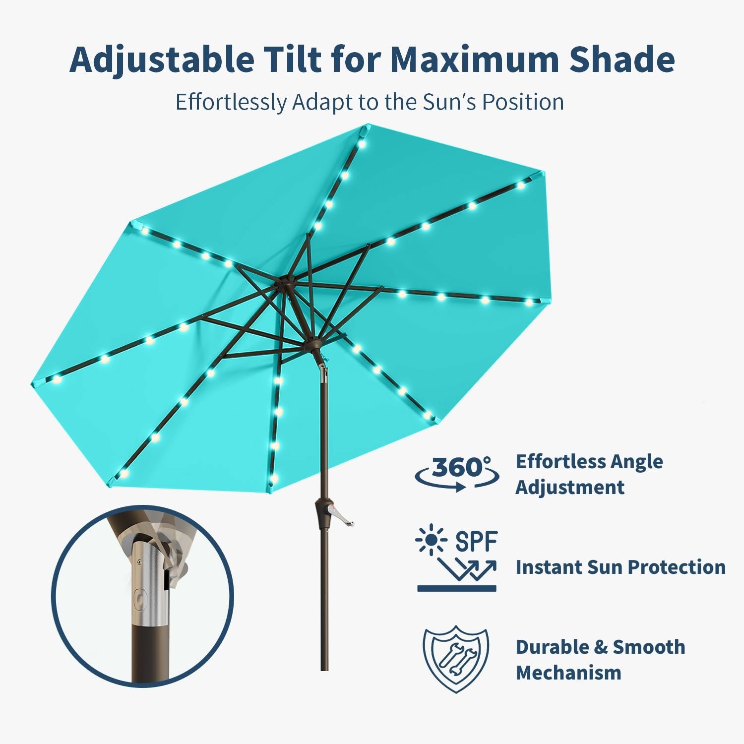 10FT Solar Umbrella 32 LED Lighted Patio Umbrella Table Market Umbrella w/Tilt and Crank, UV-Resistant Outdoor Umbrella for Pool, Garden, Deck, Aqua Blue