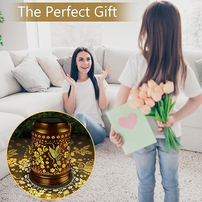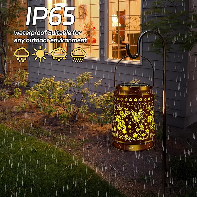 • Perfect Garden Decorative Design:The 2025 new solar Hummingbird lantern waterproof outdoor lights retro appearance with bronze color and hollow out metal veneer,and hollow out metal veneer,The solar lanterns casts bright and led warm light in darkness,Accompanied by gorgeous and graceful hummingbird and flower patterns,Adding a beautiful atmosphere to the surrounding environment.