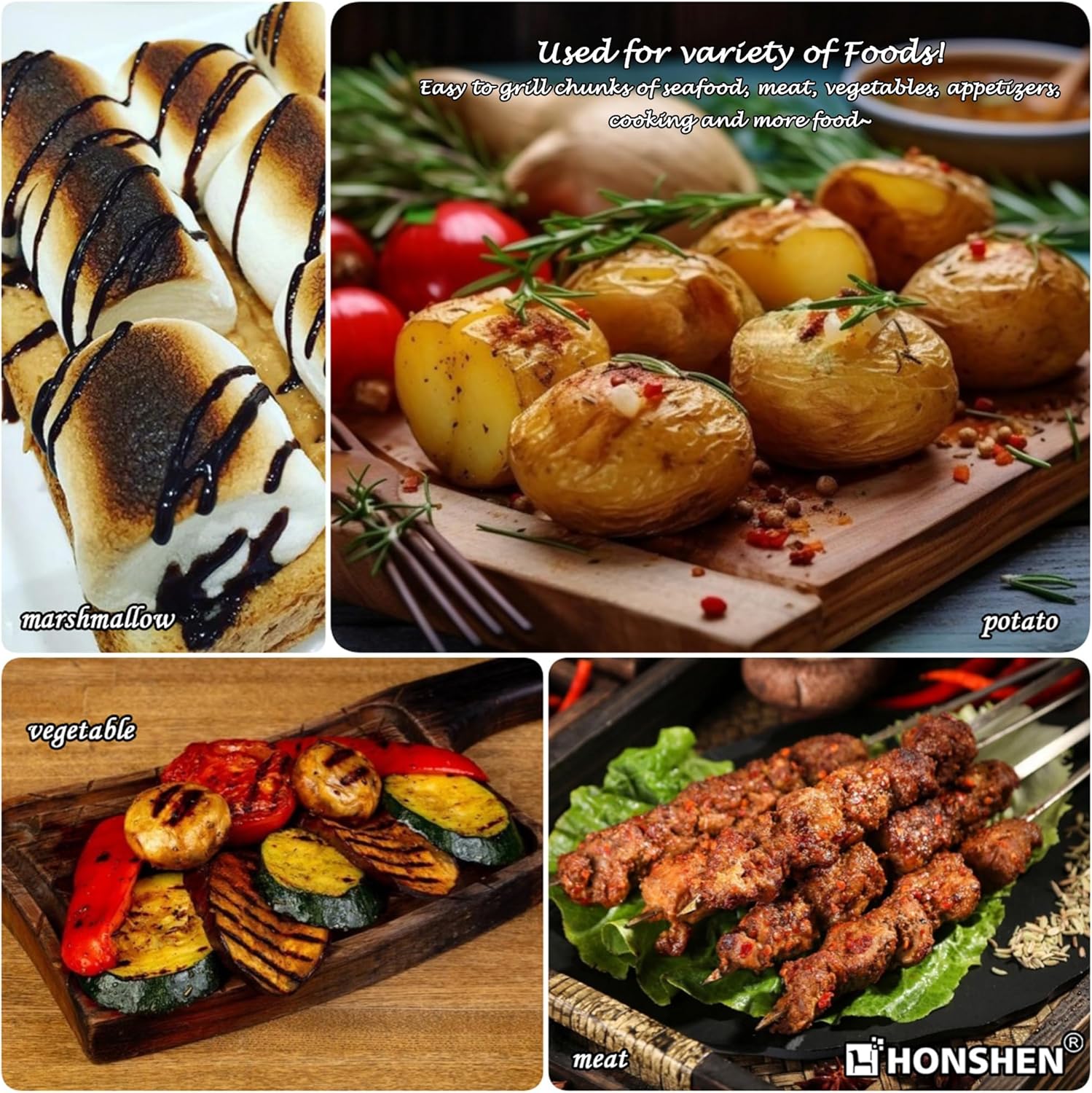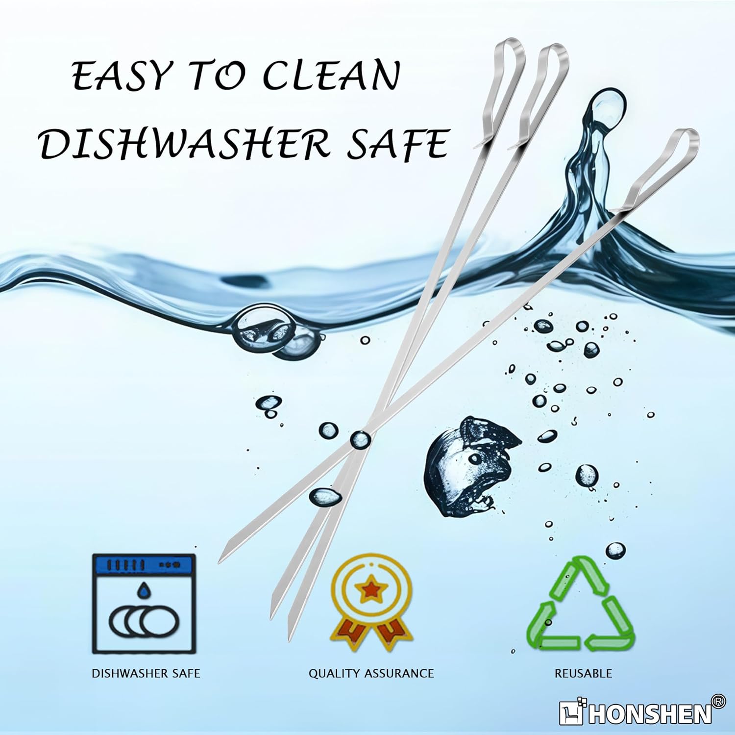 • MULTIPURPOSE & EASY TO CLEAN: Stainless steel kabob skewers are reusable. After each time’s use, just let these grilling skewers sit in warm water, hand wash with gentle detergent or threw them in dishwasher,wipe away water and keep in dry place, and they’ll come out as new. The metal shish kabab skewers can be can be reused, saving you money completely. Perfect tool for grilling kabobs, hotdogs, sausages, seafood, s'mores or even for making treats like candy apples and tanghulu;