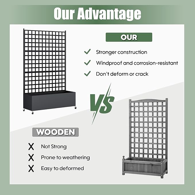 • Versatile Design--This metal planter with trellis serves triple purposes as an elevated garden bed for flowers/plants, a sturdy trellis for climbing flora, or a stylish privacy screen to enhance outdoor living spaces. Its adaptable structure makes it the ultimate gardening solution for diverse needs.