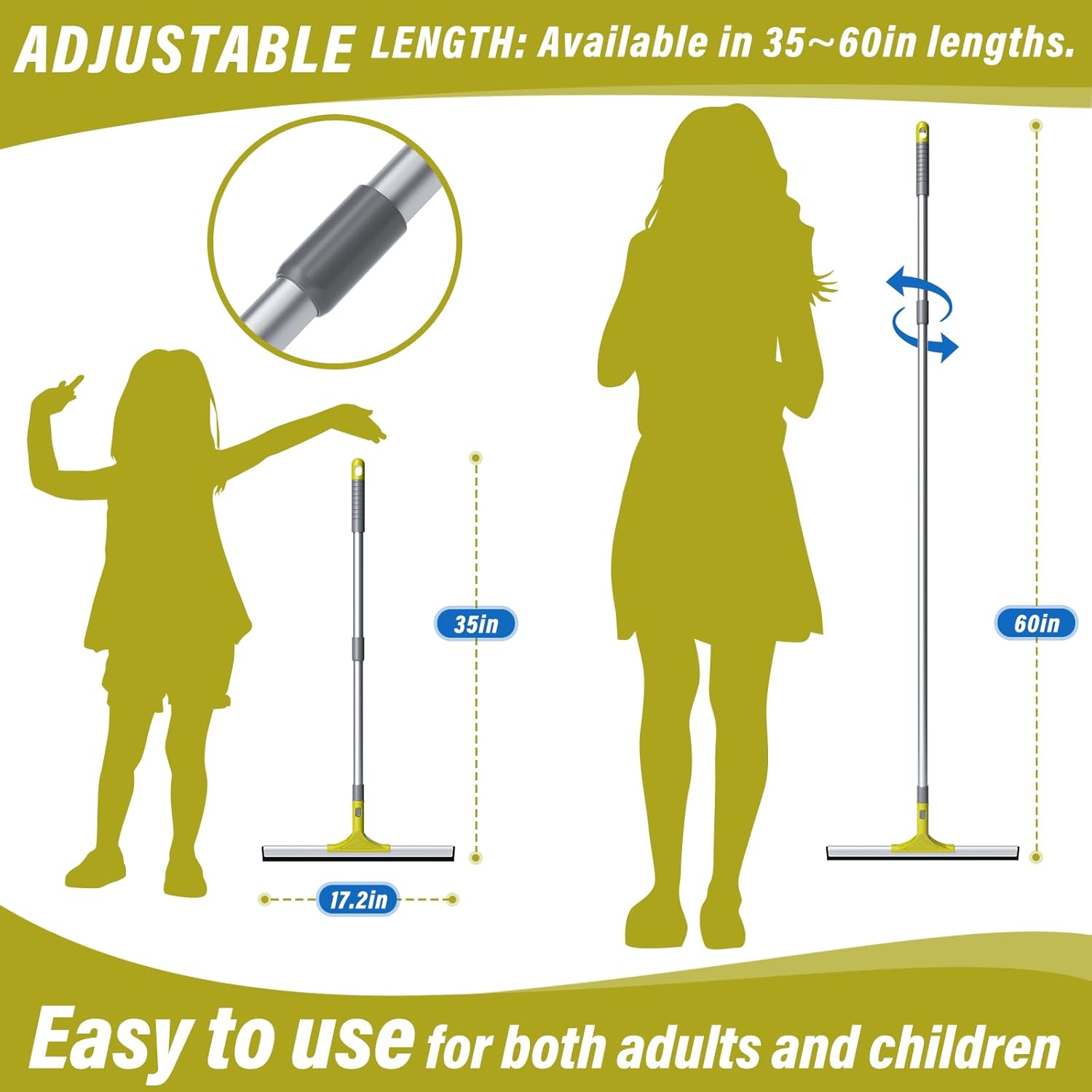 • Humanized Design - This long handled squeegee features a telescopic pole, adjustable length from 35 inches to 60 inches by removing or adding sections, say goodbye to bending over and easily reach or any high places. The bathroom squeegee for shower is designed with a removable interface for easy installation and removal. Comes with a hanging hole for easy storage