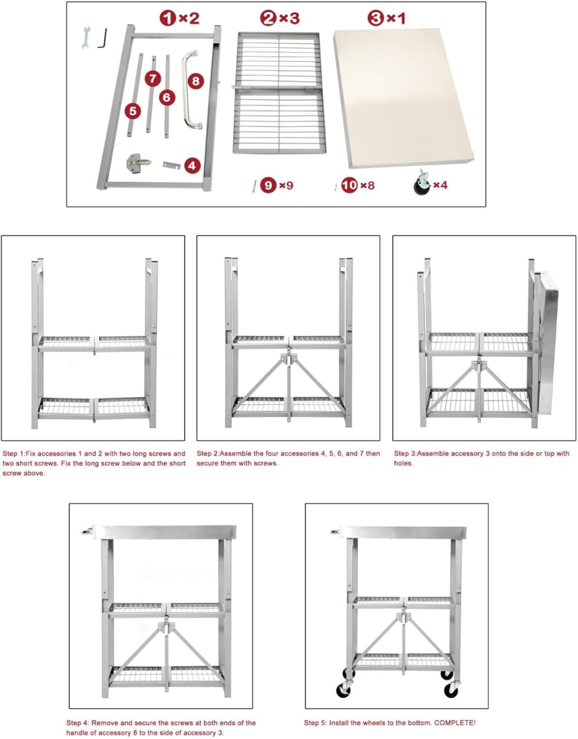 • 【Effortless Assembly and Foldable Design】: Our foldable grill cart is designed for simplicity, this steel table can be easily assembled and instantly put to use for parties or cooking sessions. The innovative clamp design allows you to unfold and secure the cart effortlessly. When not in use, fold it back to a thin size for easy storage, ensuring it remains compact and space-saving.
