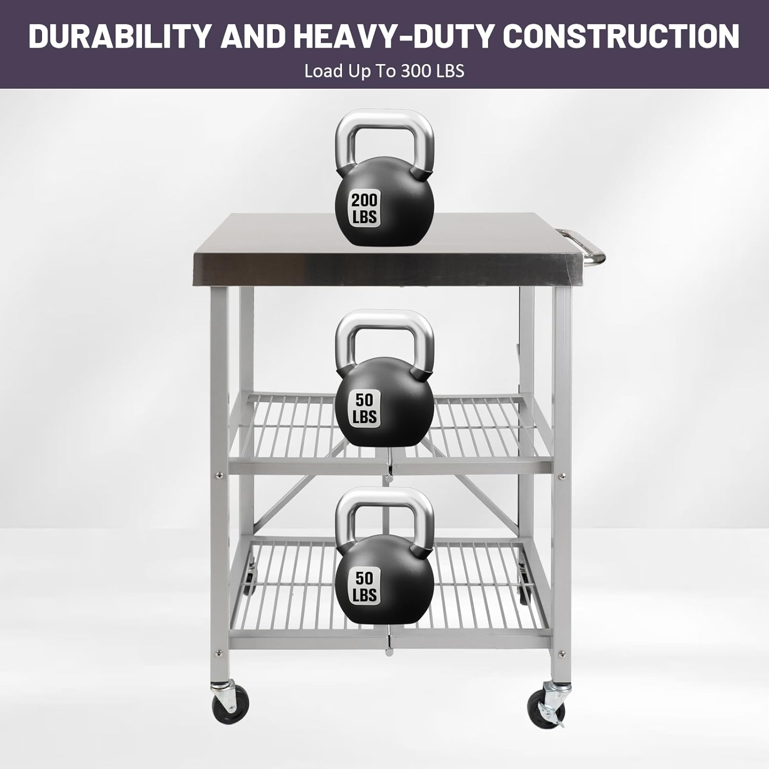 • 【Durability and Heavy-Duty Construction】: Built to last, our folding steel cart is made from heavy-duty, anti-rust, and corrosion-resistant stainless steel. The robust tabletop can support up to 100kg, while the two lower levels each support 25kg, allowing it to carry up to 300 lbs of heavy objects. Perfect for storing and transporting large kitchen appliances or heavy machinery, this rolling island for kitchen offers durability and safety for years to come.