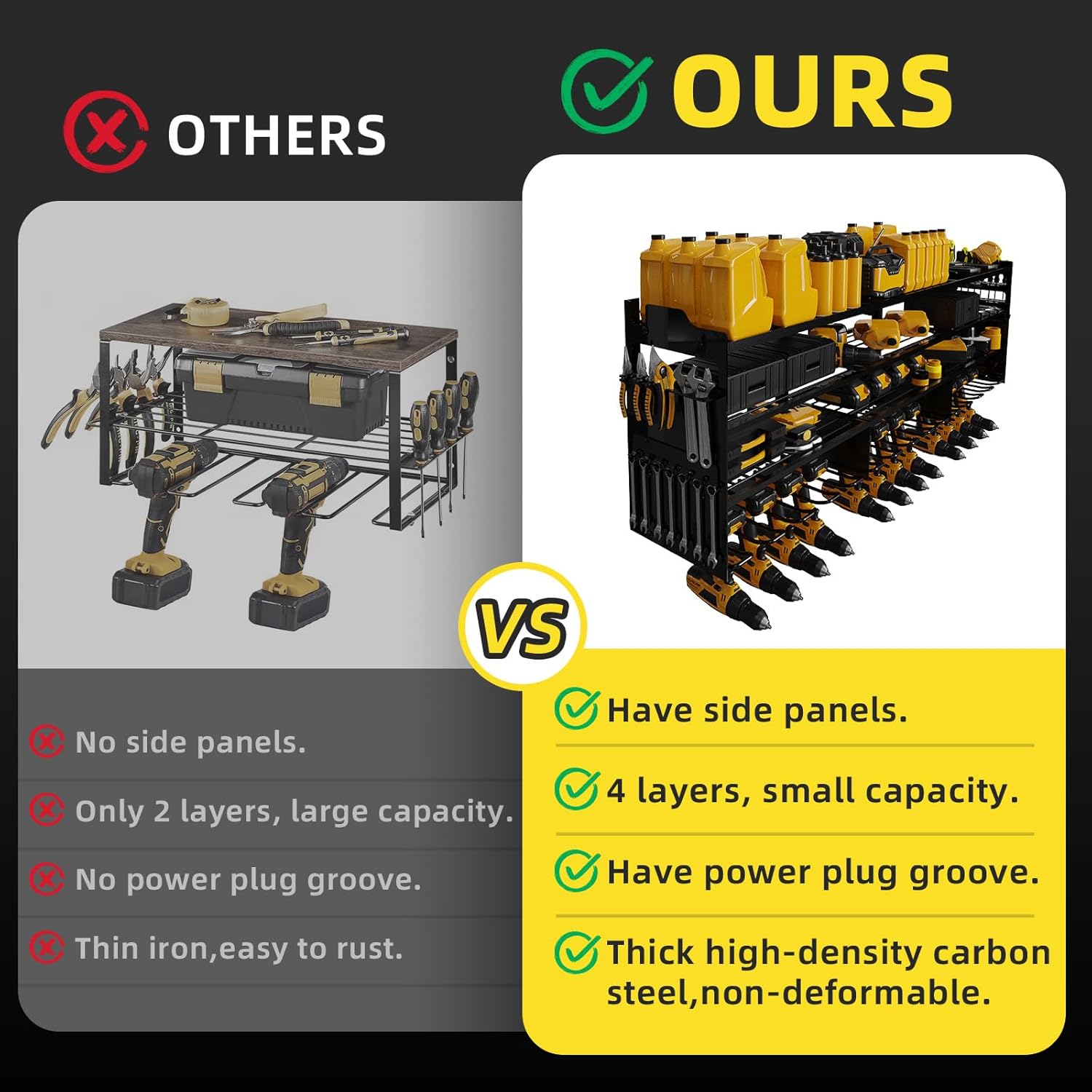• 🔧【LARGE CAPACITY&SIDE PLATE】This wall-mounted power tool organizer is more storage space than standard tool racks.It has 4-layer high-capacity design and 12 cordless drill holders and 2 side-plates, great for storge electric drills/power drivers/impact wrenches/mpact drills/cutters/angle grinders and other handheld power tools.The 4-layer can hold batteries, saws,wrenches,chargers and other tools, and the side racks can hold wrenches/screwdrivers/hammers/pliers, scissors, etc.