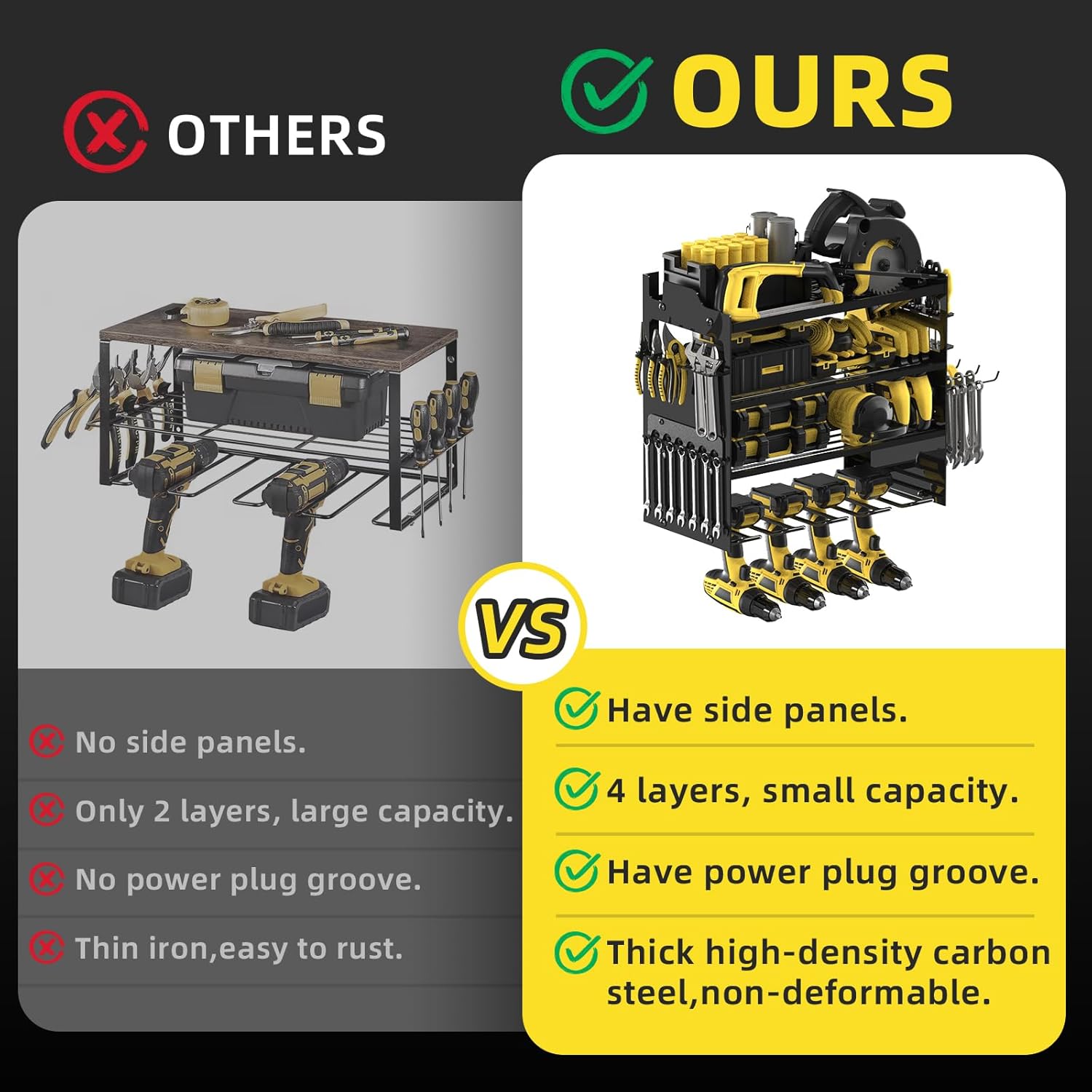 • 🔧【LARGE CAPACITY&SIDE PLATES】This wall-mounted power tool organizer is more storage space than standard tool racks.It has 4-layer high-capacity design and 4 cordless drill holders and 2 side-plates,great for storge electric drills/power drivers/impact wrenches/mpact drills/cutters/angle grinders and other handheld power tools.The 4-layer can hold batteries, saws,wrenches,chargers and other tools, and the side racks can hold wrenches/screwdrivers/hammers/pliers,scissors,etc.