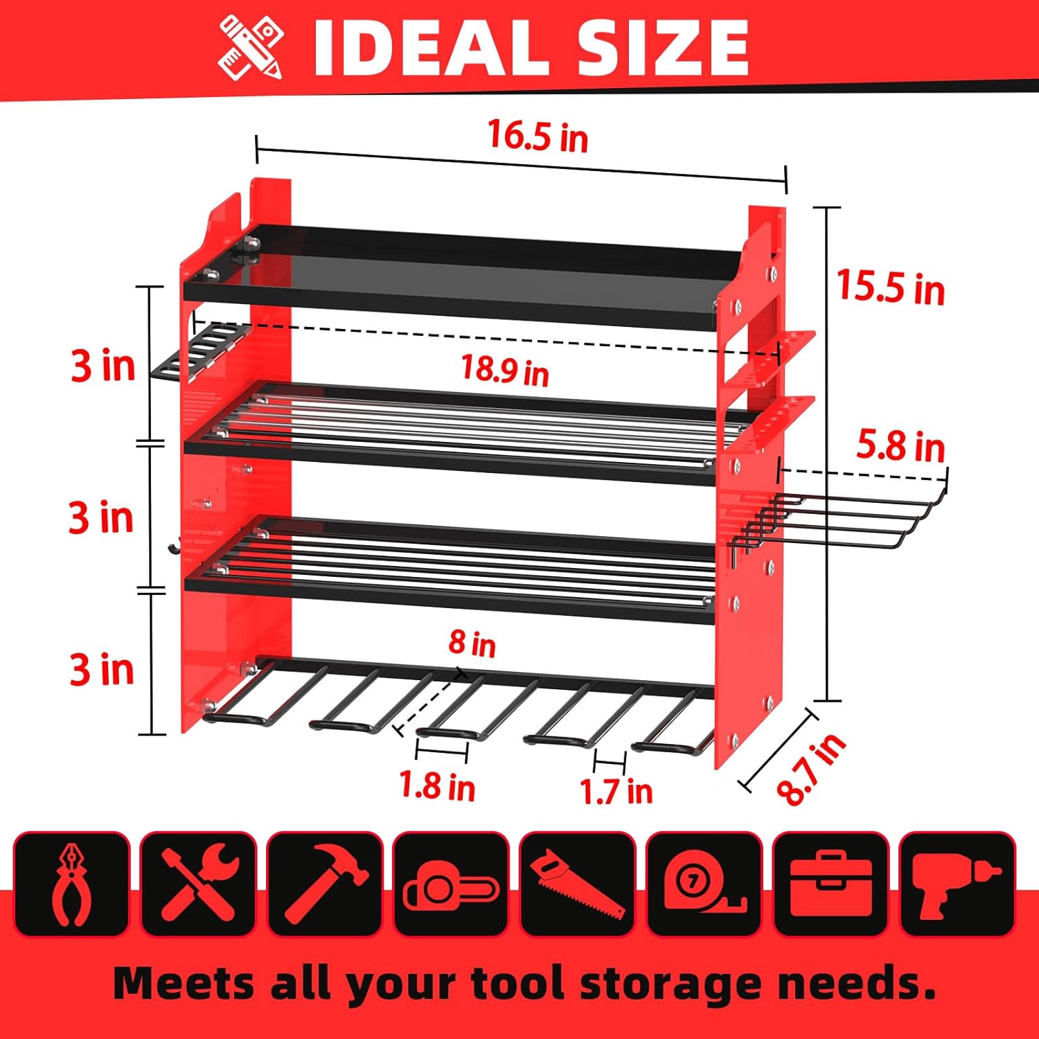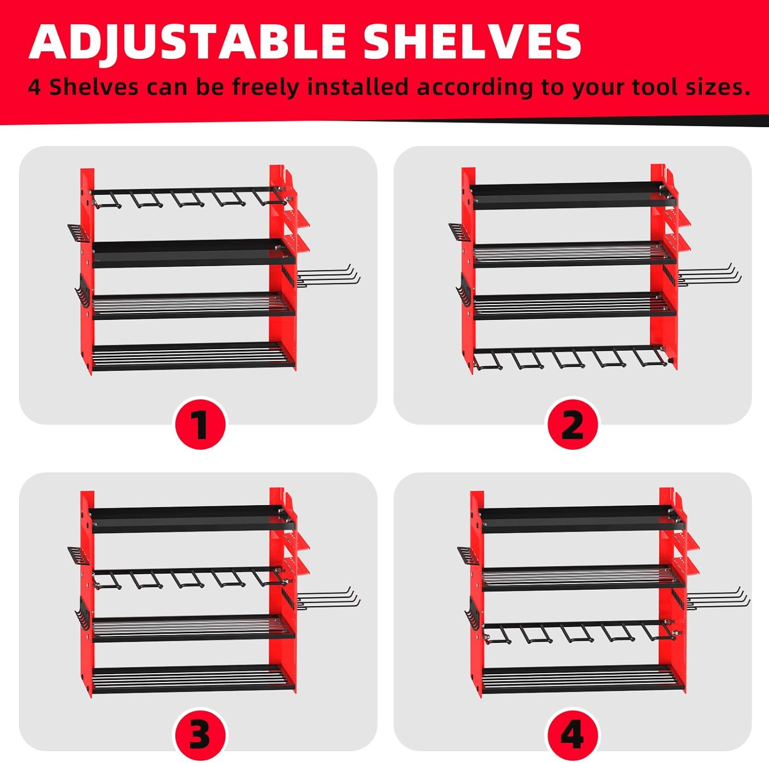 • 🧰【EASY TO ASSEMBLE】Our cordless tool organizer is Quick 10-15 min setup (clear instructions included), a perfect power tool rack for your workshop,only need to connect the plate with screws and hang it on the wall.We provide clear installation instructions and accessorie,Installation size: 33 in (L) × 8.7 in (W) × 15.5 in (H),4 Pcs additional 5.8" detachable hooks are included.