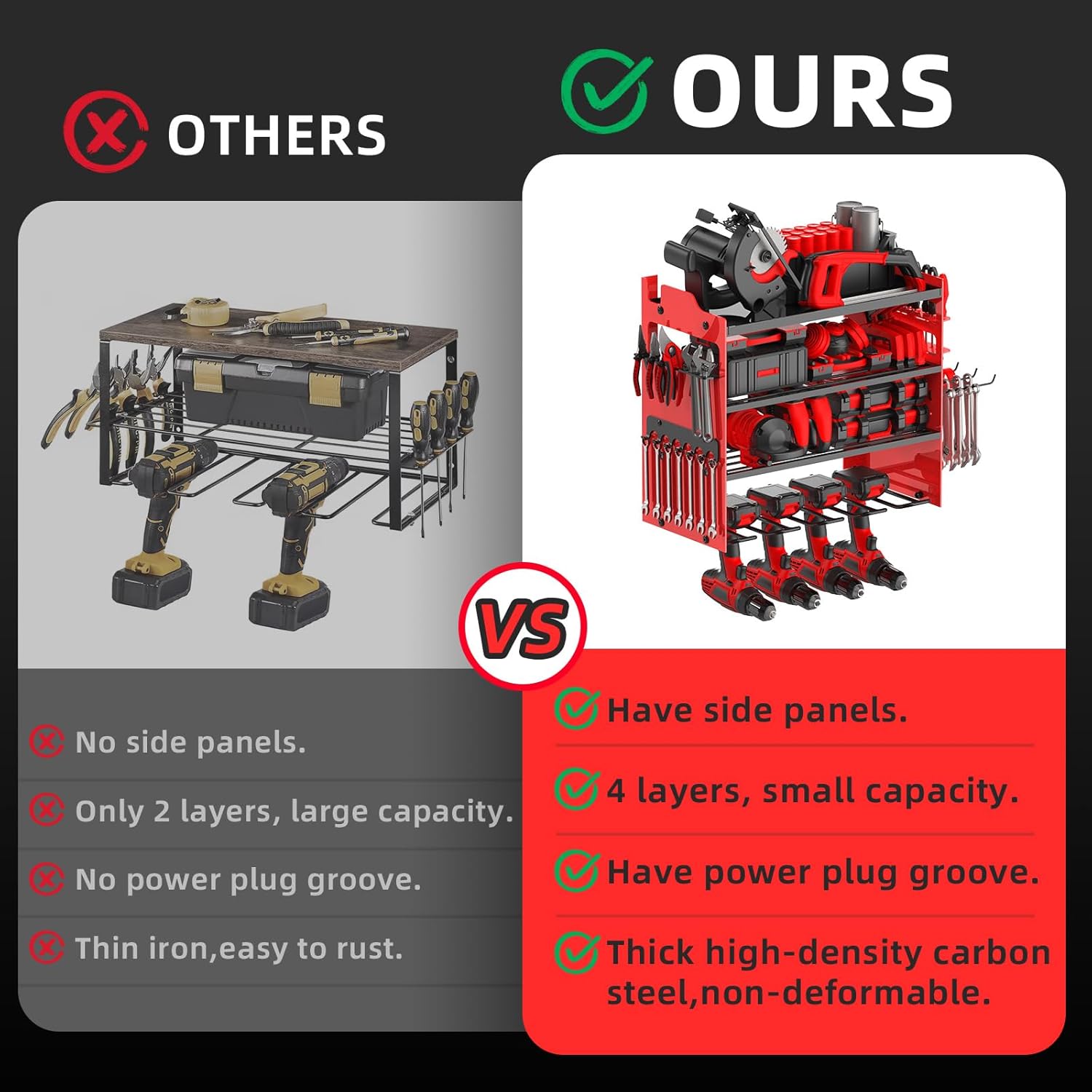• 🔧【LARGE CAPACITY&SIDE PLATES】This wall-mounted power tool organizer is more storage space than standard tool racks.It has 4-layer high-capacity design and 4 cordless drill holders and 2 side-plates, great for storge electric drills/power drivers/impact wrenches/mpact drills/cutters/angle grinders and other handheld power tools.The 4-layer can hold batteries, saws,wrenches,chargers and other tools, and the side racks can hold wrenches/screwdrivers/hammers/pliers,scissors,etc.