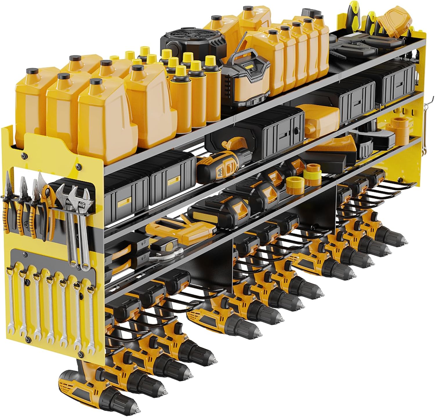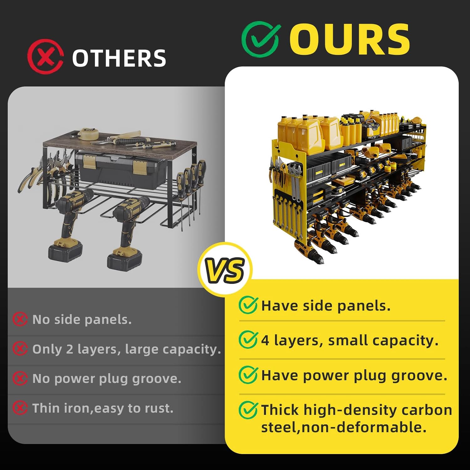 • 🔧【LARGE CAPACITY&SIDE PLATE】This wall-mounted power tool organizer is more storage space than standard tool racks.It has 4-layer high-capacity design and 12 cordless drill holders and 2 side-plates, great for storge electric drills/power drivers/impact wrenches/mpact drills/cutters/angle grinders and other handheld power tools.The 4-layer can hold batteries, saws,wrenches,chargers and other tools, and the side racks can hold wrenches/screwdrivers/hammers/pliers, scissors, etc.