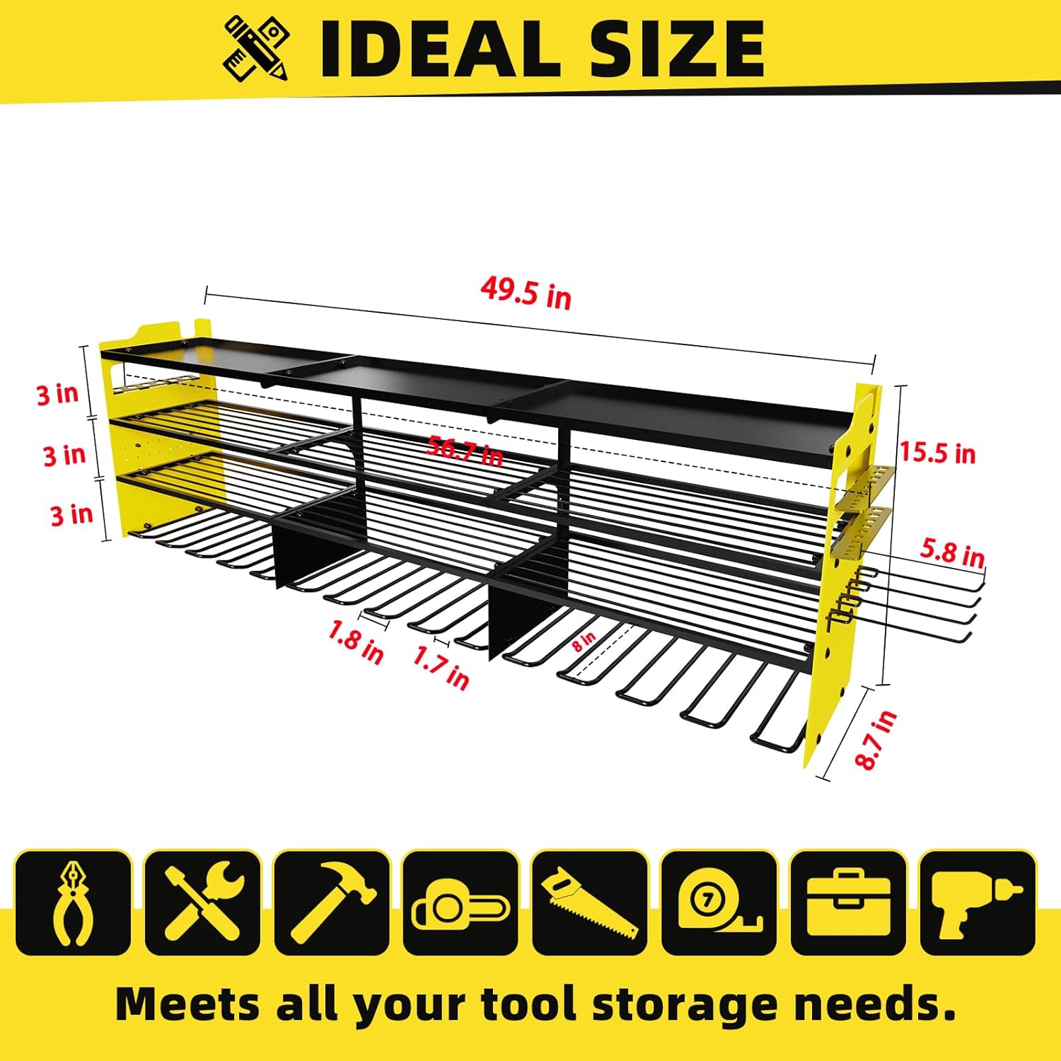 • 🧰【EASY TO ASSEMBLE】Our cordless tool organizer is Quick 10-15 min setup (clear instructions included), a perfect power tool rack for your workshop,only need to connect the plate with screws and hang it on the wall.We provide clear installation instructions and accessorie,Installation size: 49.5 in (L) × 8.7 in (W) × 15.5 in (H),4 Pcs additional 5.8" detachable hooks are included.