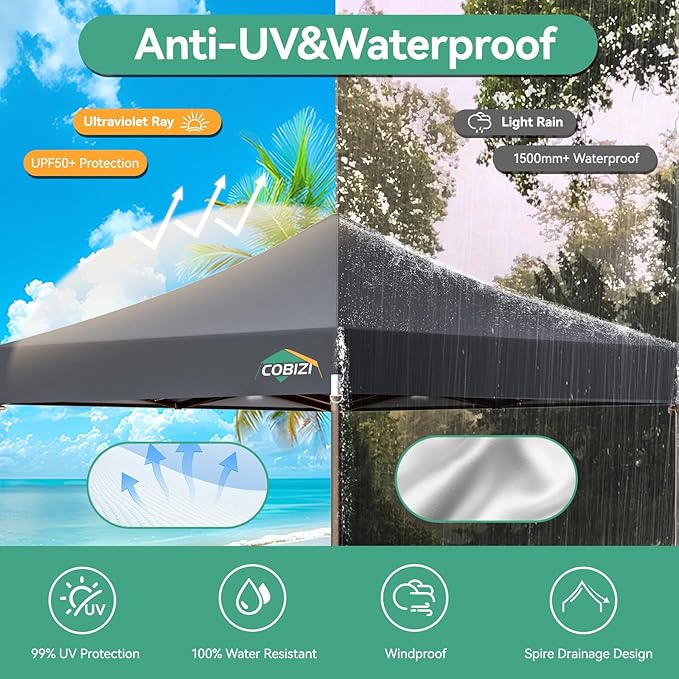 • [Premium Quality Fabric] 10x15 pop up canopy tent is made of 420g waterproof oxford fabric. The top fabric is coated with two layers of PVC with heat-sealed seams waterproof strip technology, 100% waterproof and blocks 99% UV rays.PVC coated top fabric has better light transmission than other silver coated top fabrics on the market, the tent space is more transparent.