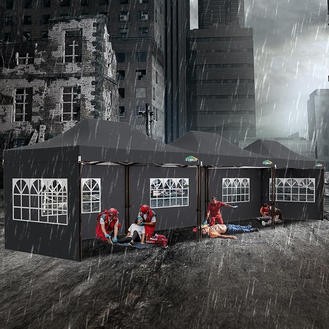 • [Upgrade Heavy Duty Canopy] The COBIZI 10x15 Heavy Duty Canopy features a commercial-grade full truss structure constructed from durable powder-coated stainless steel. The thickness of the 1.77 inch (45mm) hexagonal legs has been increased to 0.7mm/0.03 inches, providing superior stability and durability. Full truss design ensures exceptional sturdiness and rust resistance, capable of withstanding wind speeds of up to 30mph when properly secured with an number of sandbags, ropes, and stakes.