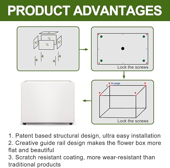 • 【ROBUST METAL CONSTRUCTION】Crafted from sturdy galvanized steel+aluminium, this spacious planter boasts exceptional durability, ensuring it withstands outdoor elements without rusting or fading. Its weather-resistant design makes it suitable for year-round use in temperatures ranging from freezing cold to scorching heat, ideal for enhancing both indoor and outdoor settings.